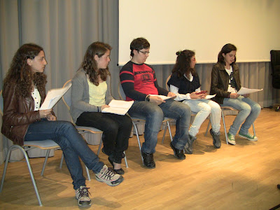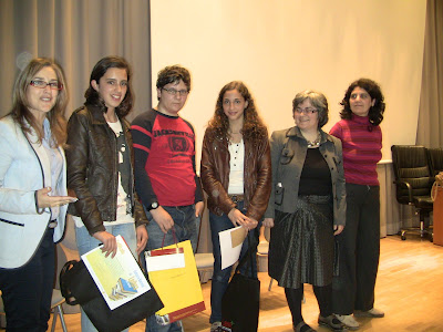Na foto os alunos Inês Vaz, Gil Carvalho e Inês Carvalho ladeados pelo júri distrital composto pela directora da Biblioteca Municipal de Faro, Sandra Martins, pela professora da Universidade do Algarve, Adriana Nogueira e pela escritora Sara Monteiro.